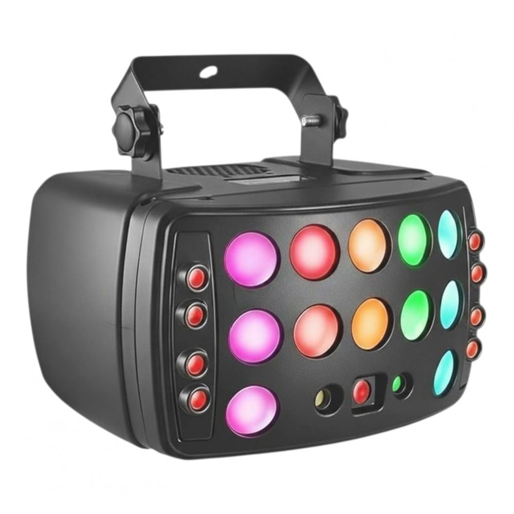 - Fuente de luz: 2 LEDs Derby RGBW 4-en-1 de 15 W, 1 estrobo blanco de 10 W, haz rojo 100 mW, haz verde 50 mW, 8 haces rojos de 100 mW